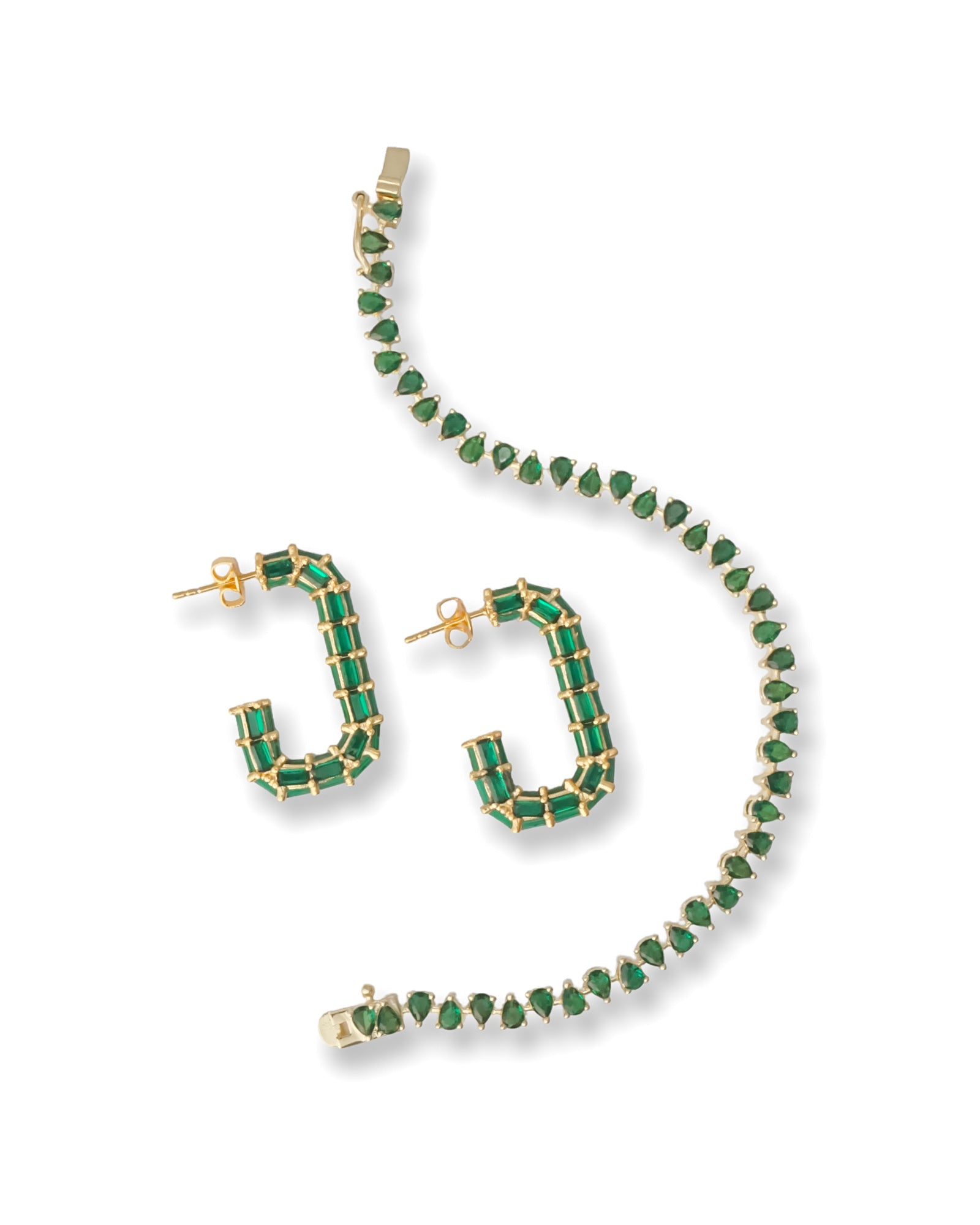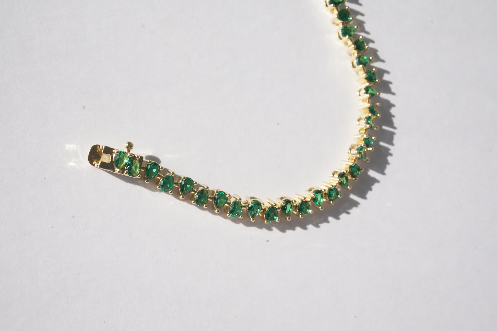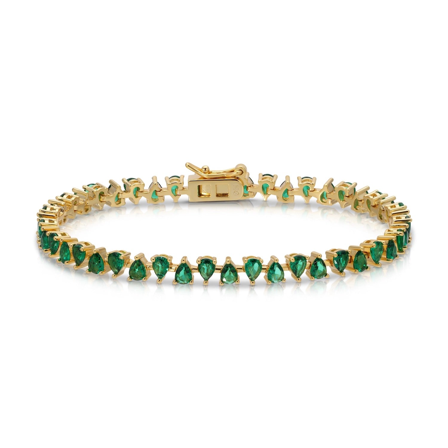 This stunning bracelet features brilliant teardrop shape green cubic zirconia stones set in 14k gold vermeil. Double locking clasp for extra security. Handcrafted in California, USA