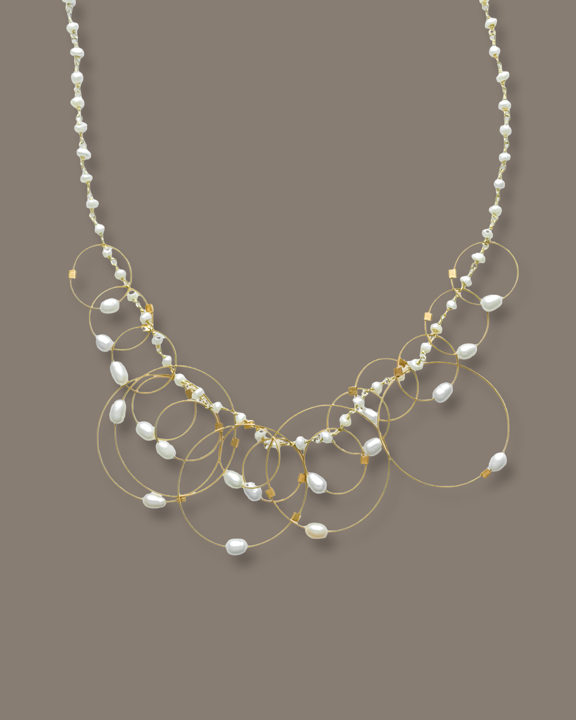 Flexible, lightweight woven 14k gold-filled stainless steel cable necklace finished with a nylon coating for a smooth feel. This piece is hand finished with little accents of 14k gold-fill and freshwater pearl. Handmade in Brooklyn, NY.