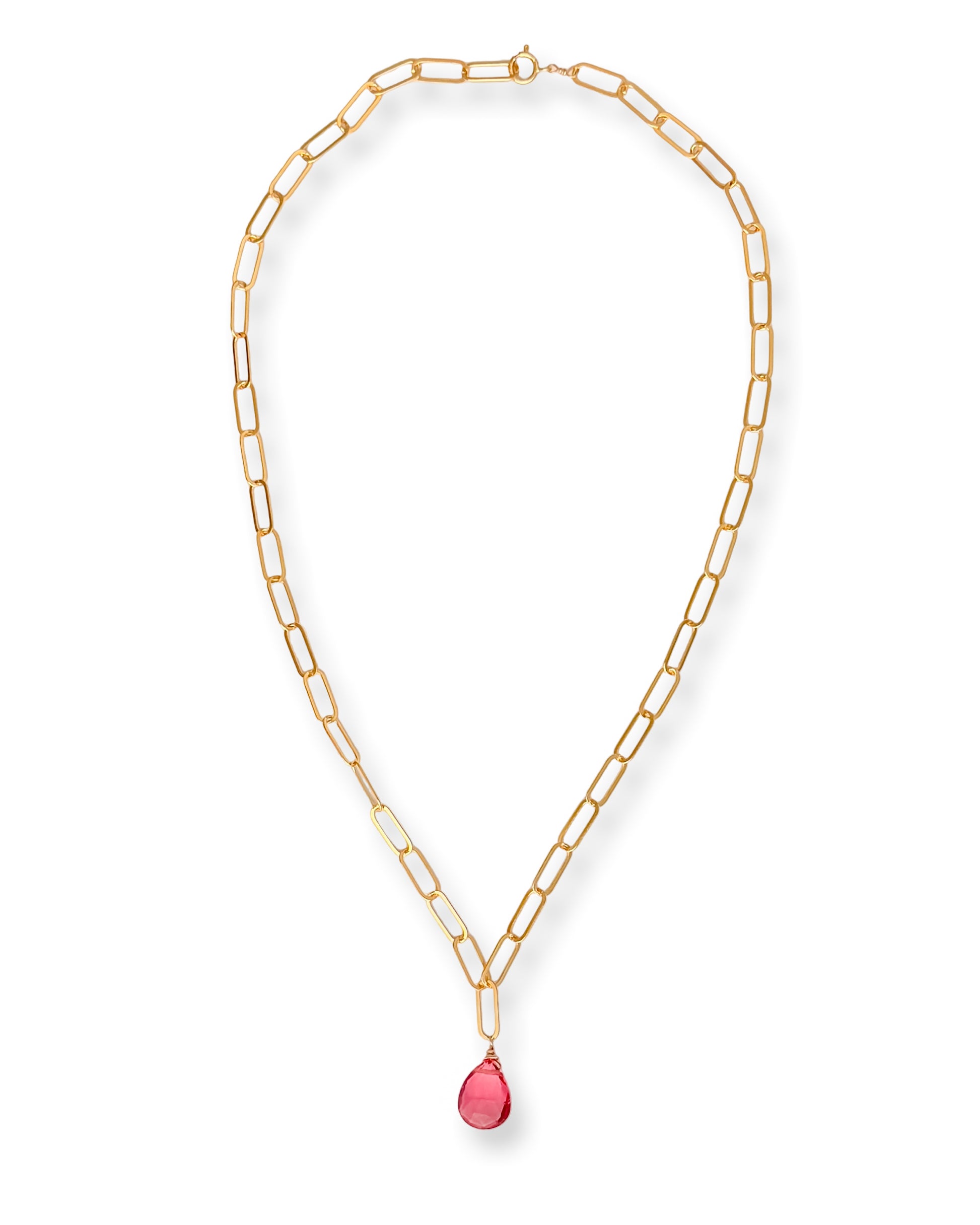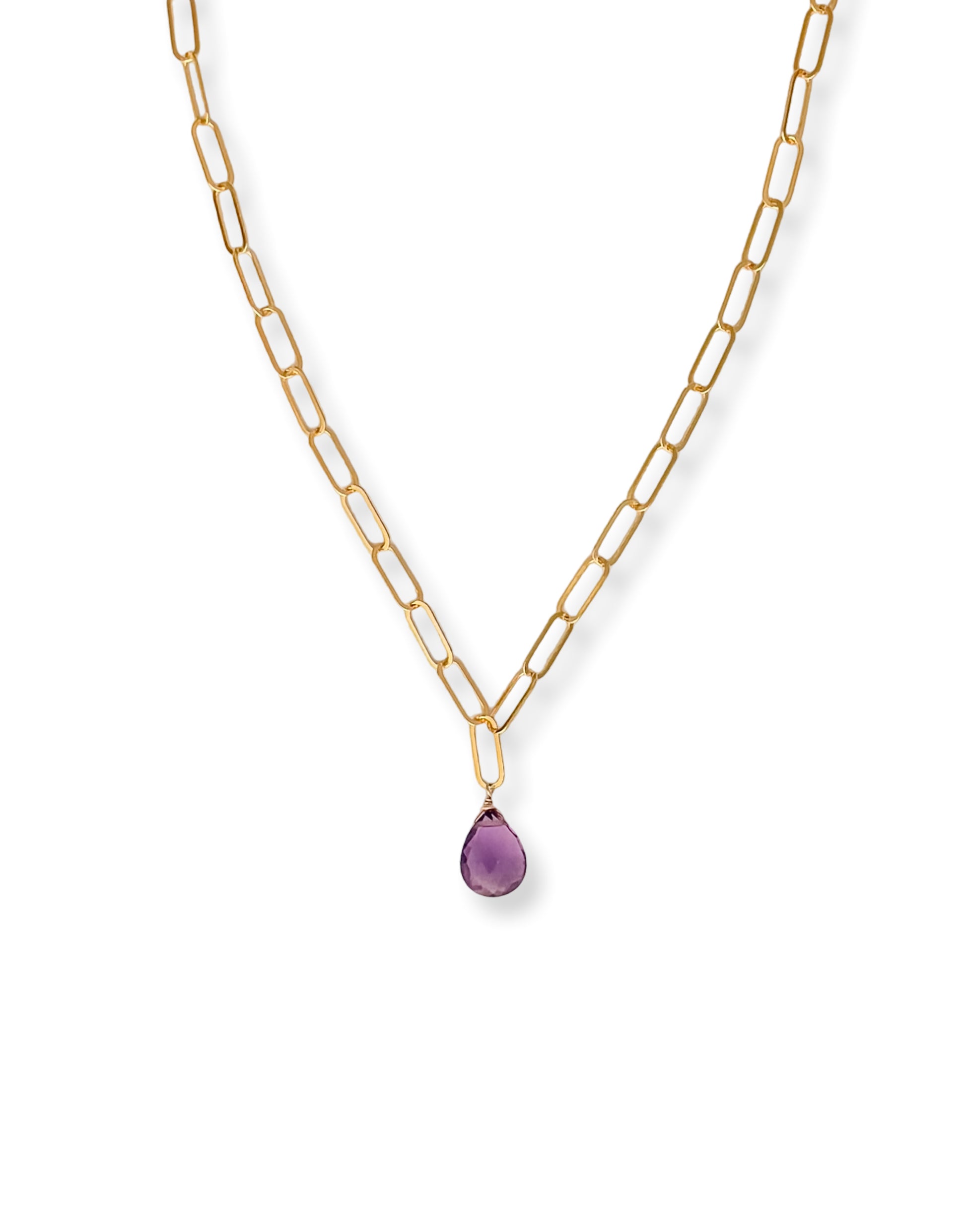 This stunning necklace features a 10x13mm genuine gemstone hand wire wrapped on 14kt gold filled chain. Offered in pink amethyst, indicolite quartz, pink quartz, and London Blue topaz. 18" adjustable chain. Handmade in California USA.