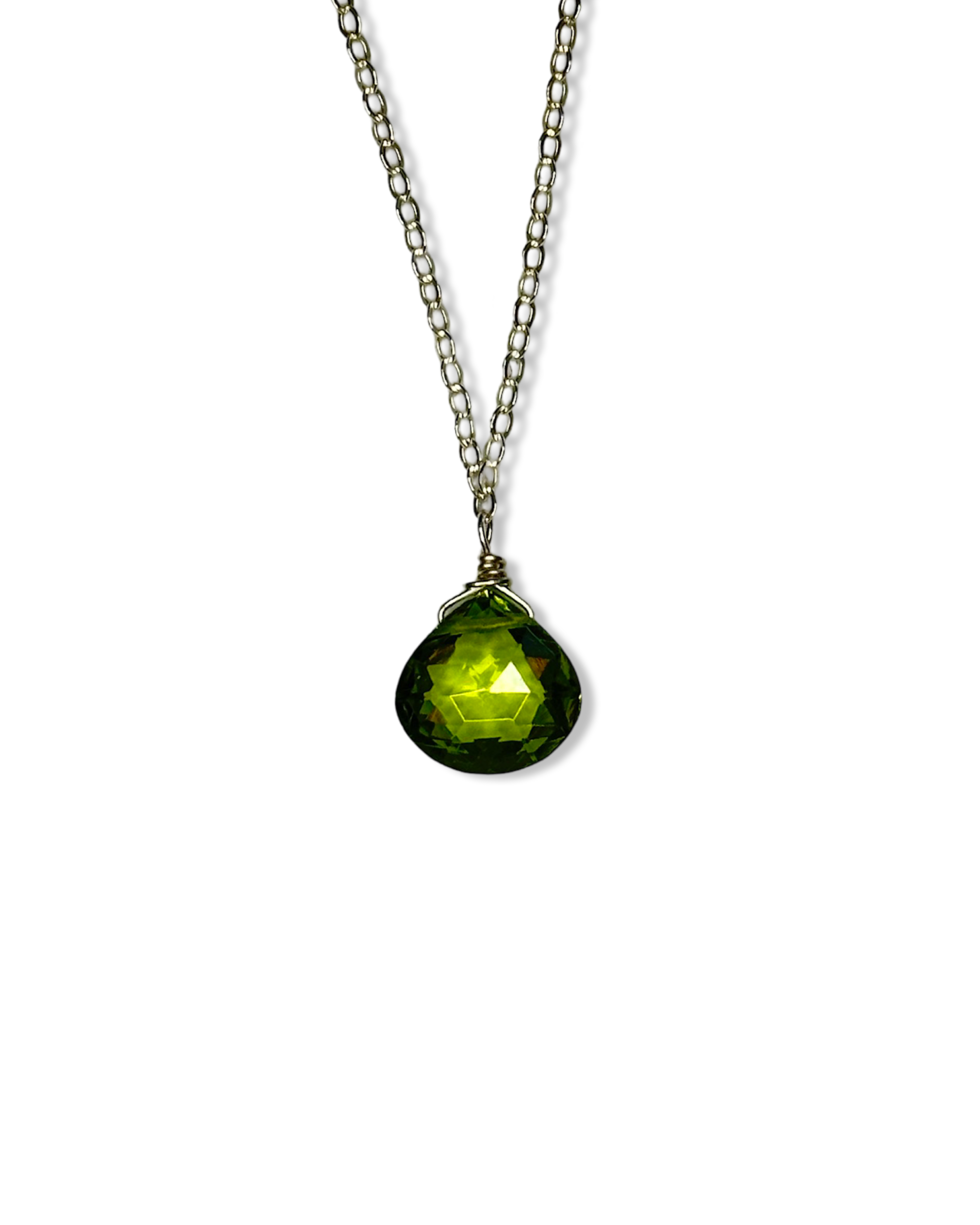 10mm genuine peridot stone on a delicate sterling silver chain. 16”. Handmade in California USA.