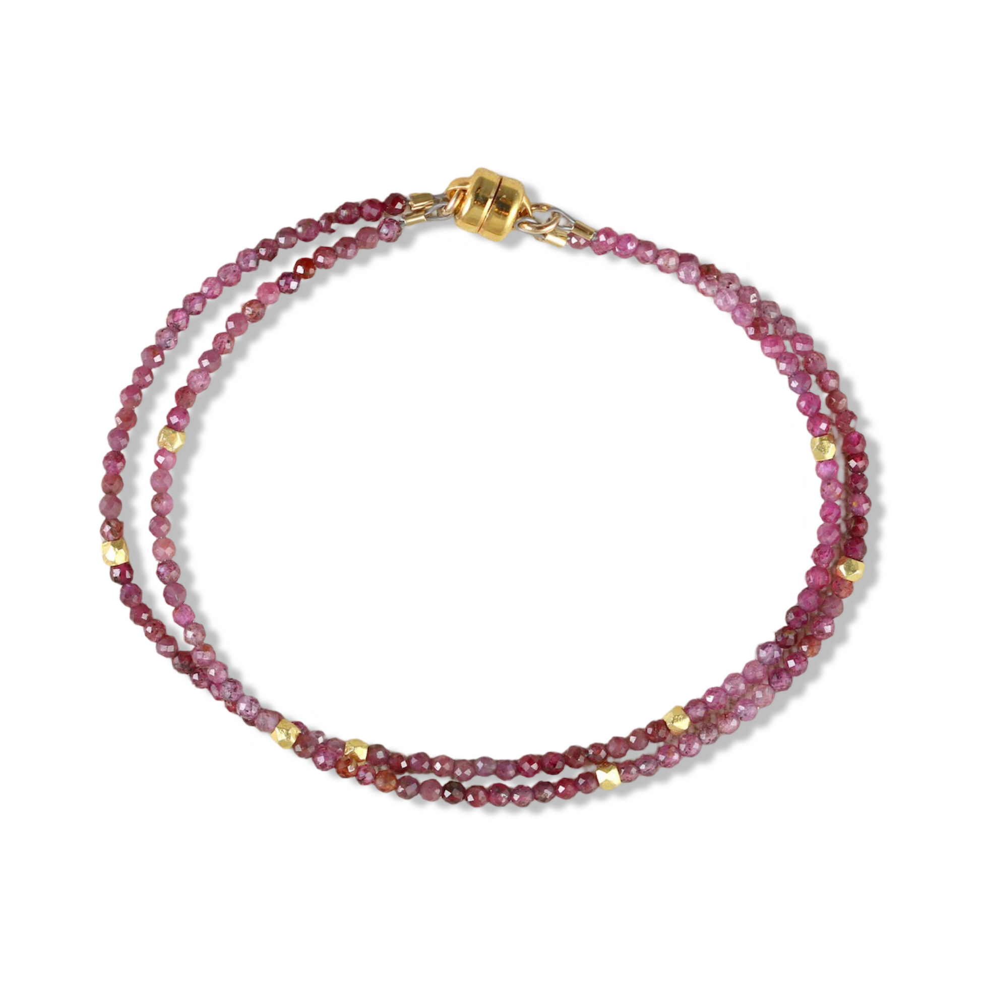 Double strand bracelet handcrafted with genuine rubies and gold vermeil accents. Strong magnetic clasp offers easy on and off. Offered in two lengths: Standard 7", Long 7.75"