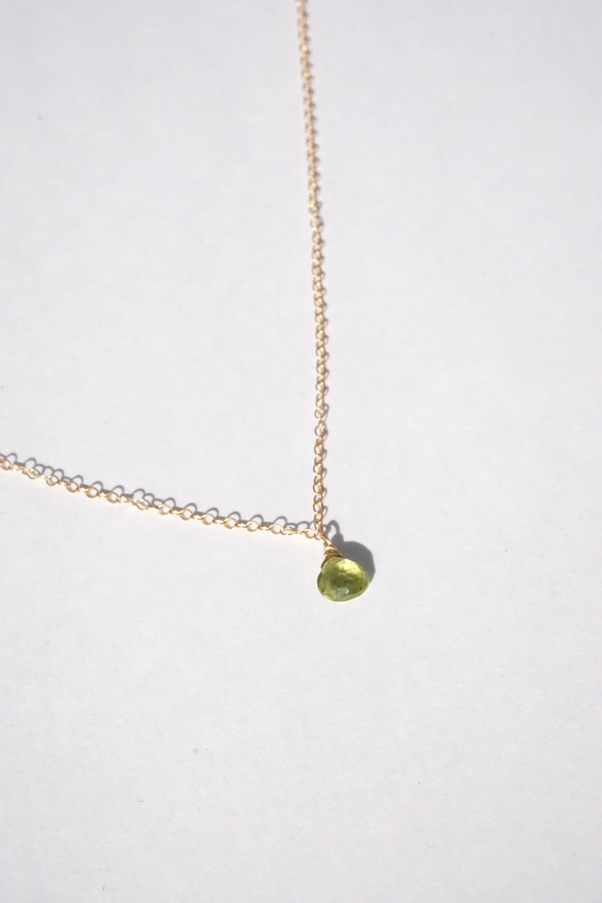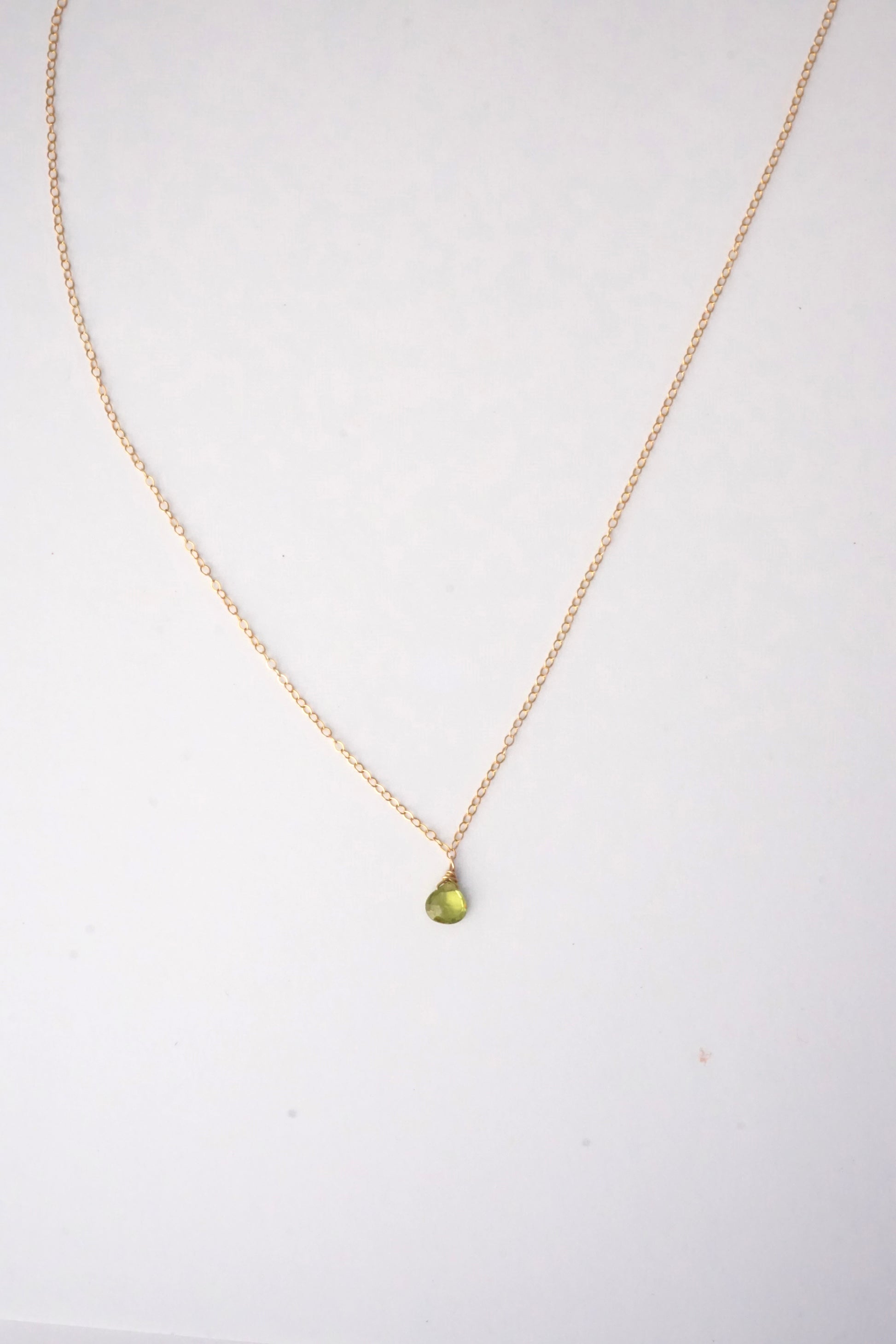 6mm genuine peridot teardrop stone on an 18” gold fill chain. Handmade in California, USA. August birthstone.