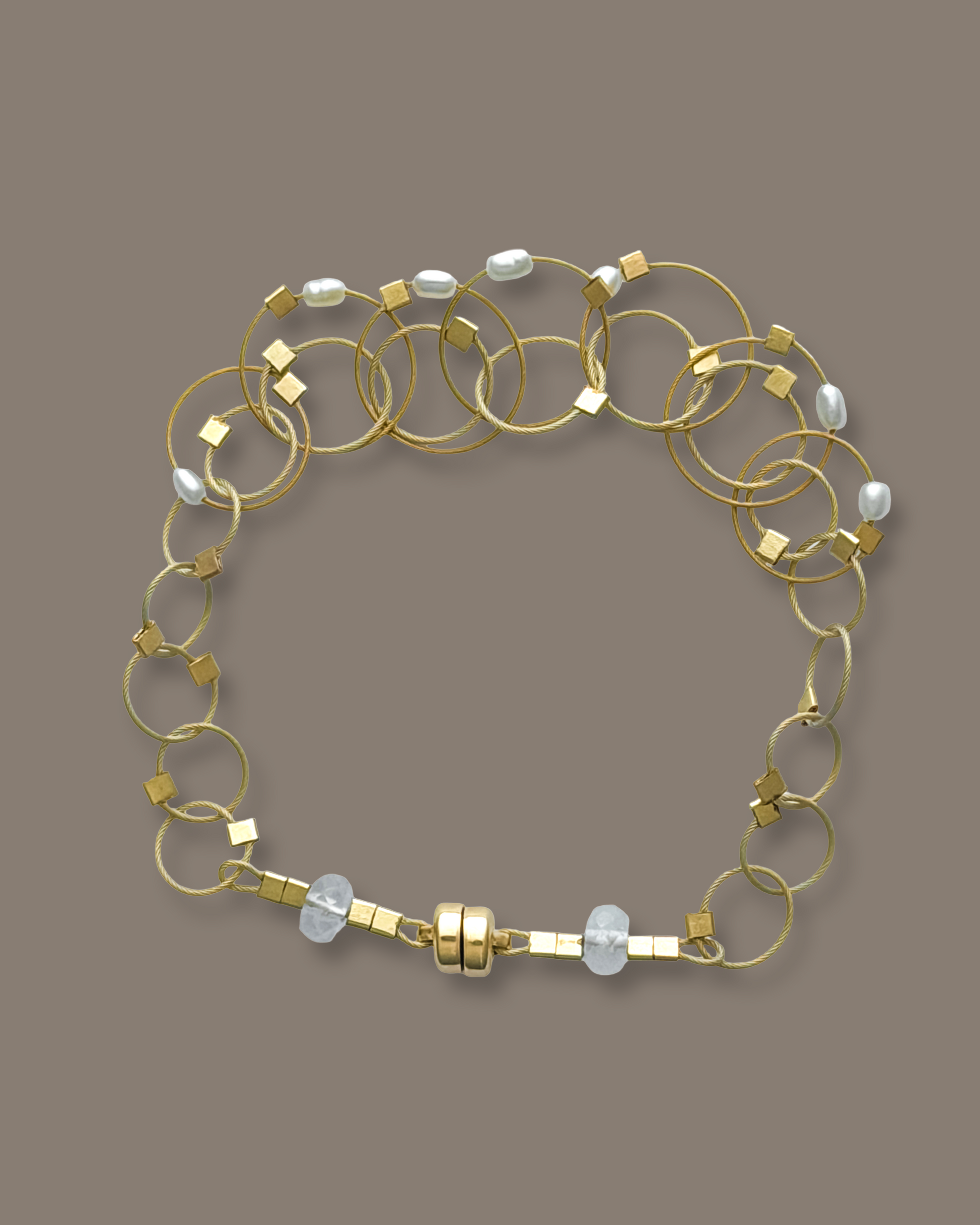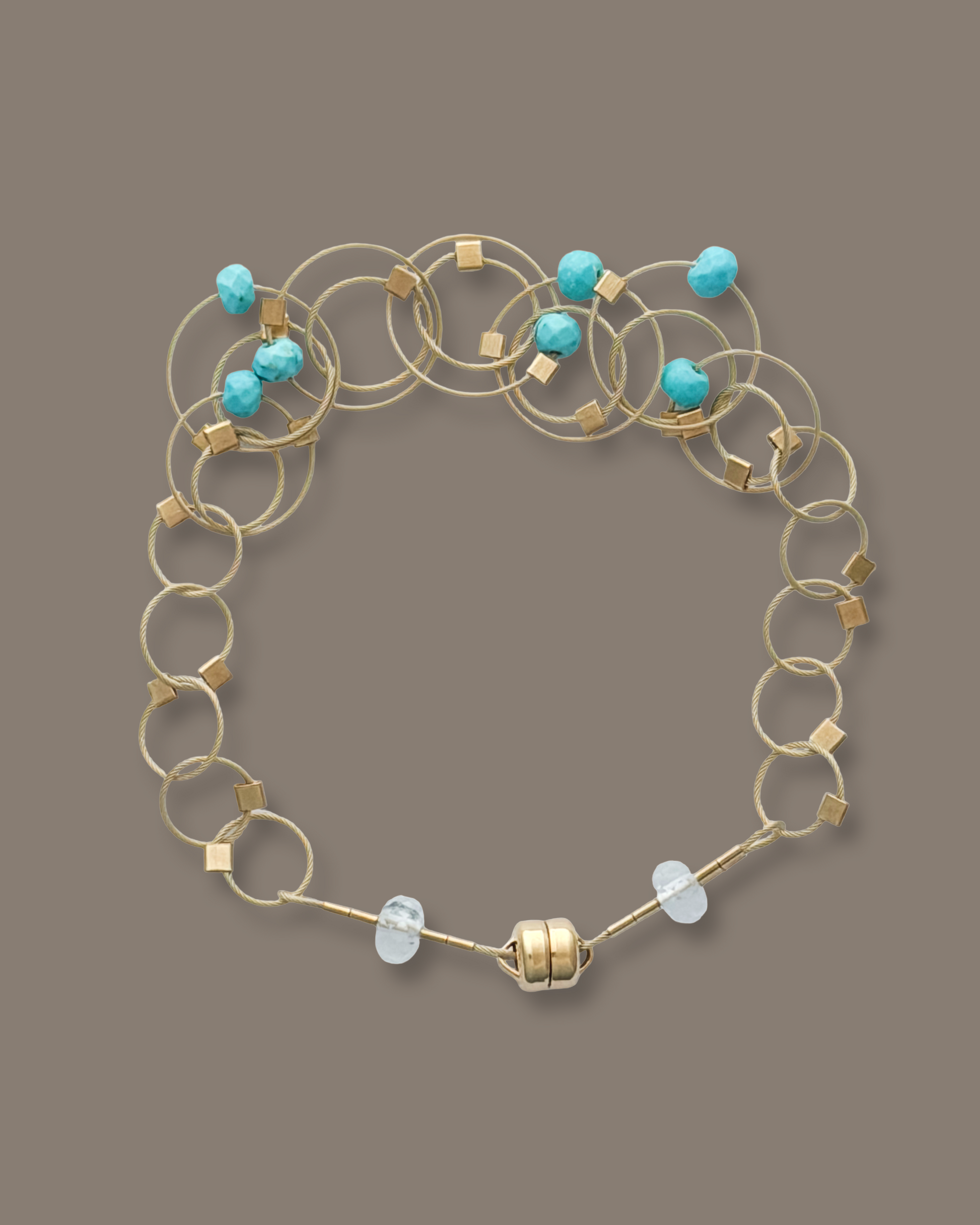 Flexible, lightweight woven 14k gold-filled stainless steel mini cable bracelet finished with a nylon coating for a smooth feel. This piece is hand finished with little accents of 14k gold-fill as well as watermelon tourmaline, pearl, or turquoise.  Handmade in Brooklyn, NY.
