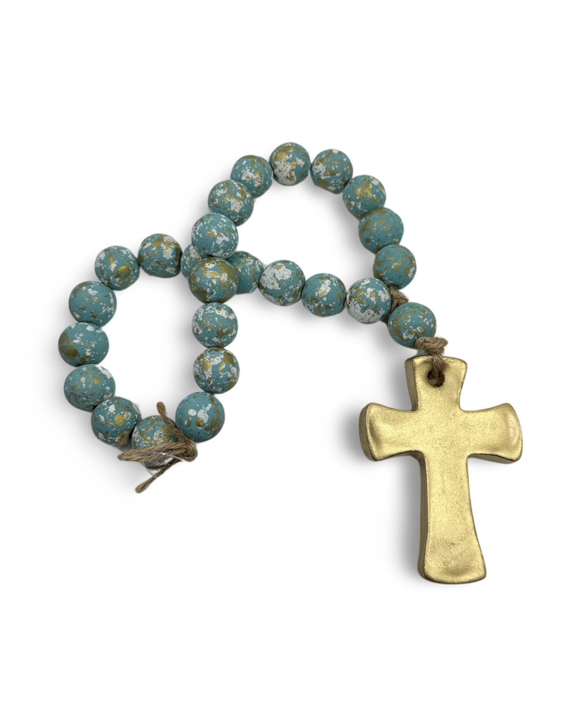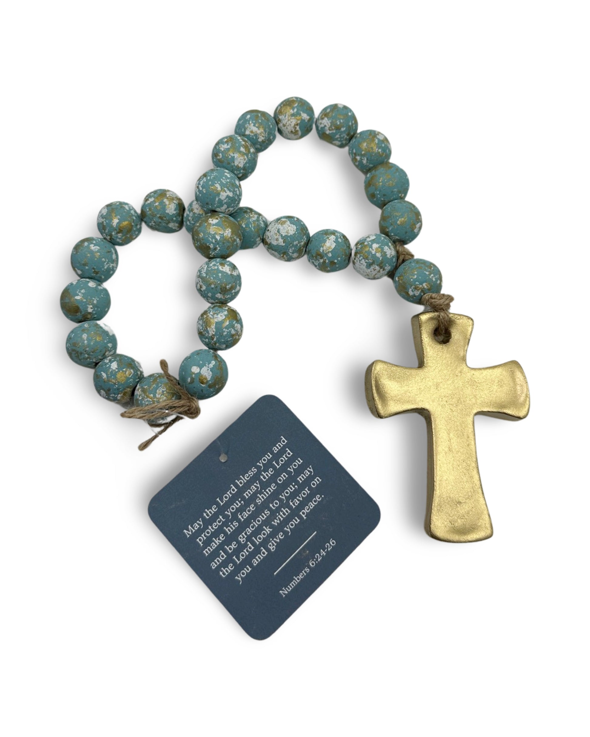 “Blessing Beads” are handcrafted with twenty five 3/4 inch hand-painted wooden beads and accented with a handmade clay cross that is enameled in gold.